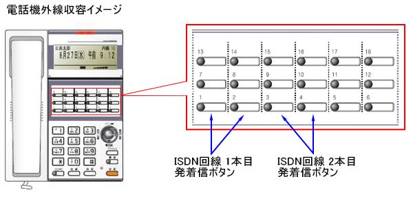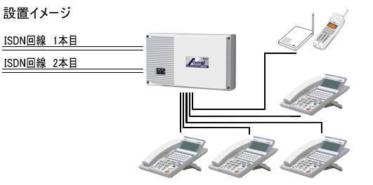 ISDN回線を2回線、置型電話機4台、コードレス1台の設置イメージ図です。